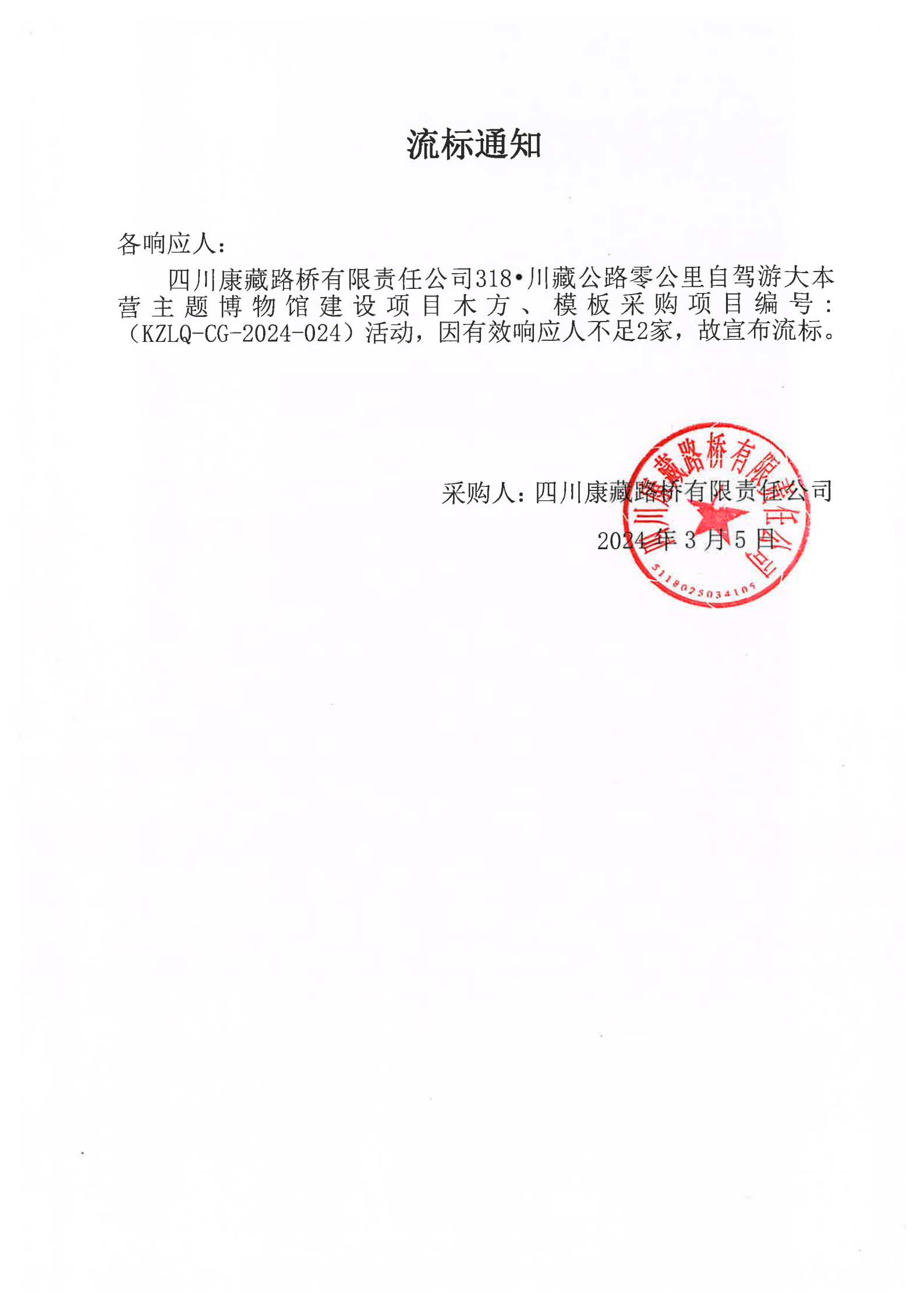 四川康藏路橋有限責(zé)任公司318·川藏公路零公里自駕游大本營(yíng)主題博物館建設(shè)項(xiàng)目木方、模板采購流標(biāo)通知