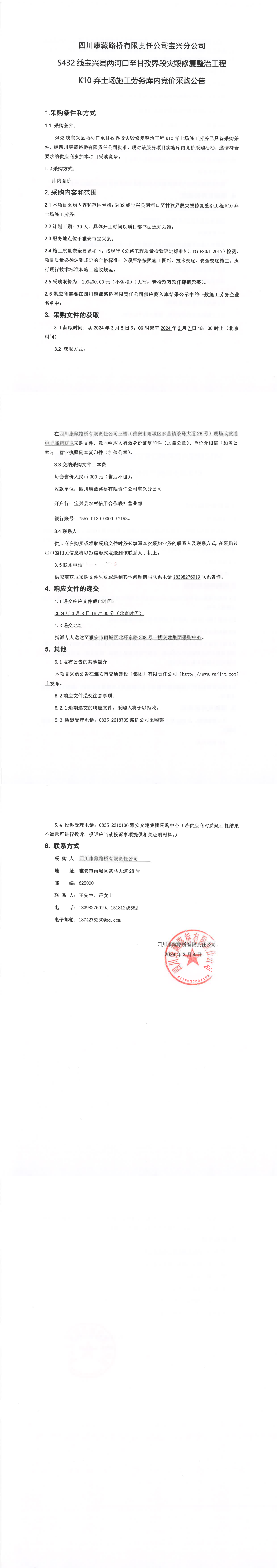 四川康藏路橋有限責任公司S432線寶興縣兩河口至甘孜界段災毀修復整治工程K10棄土場施工勞務庫內競價采購公告