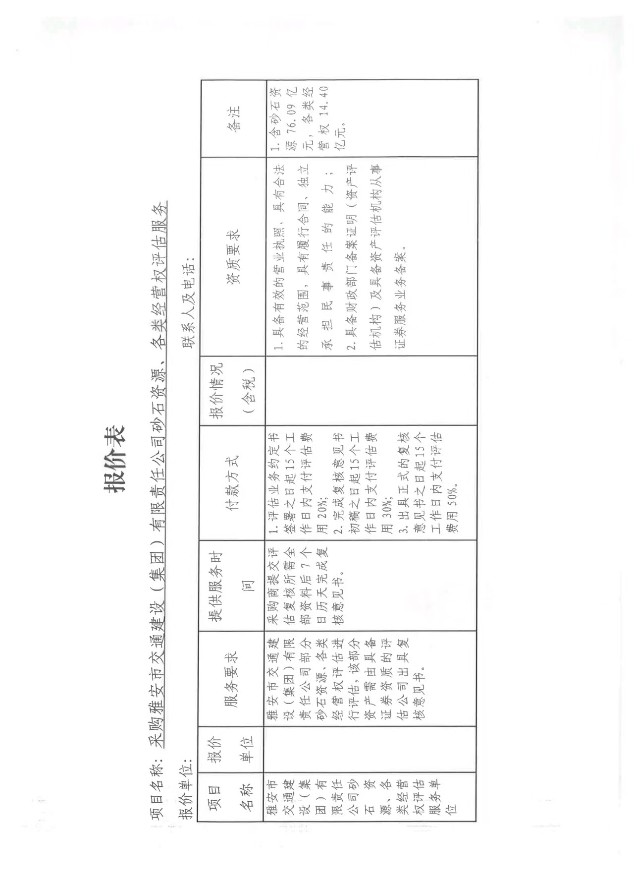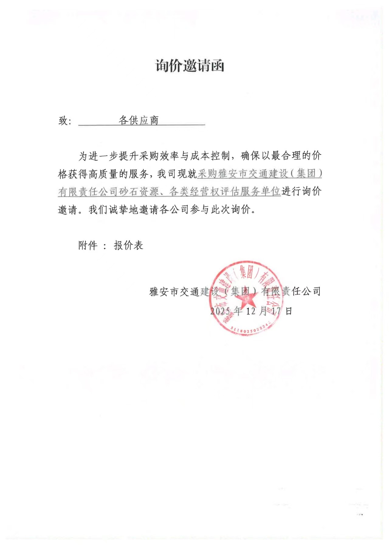 關(guān)于雅安市交通建設(shè)(集團(tuán))有限責(zé)任公司砂石資源、各類經(jīng)營權(quán)評估服務(wù)限價(jià)的詢價(jià)函