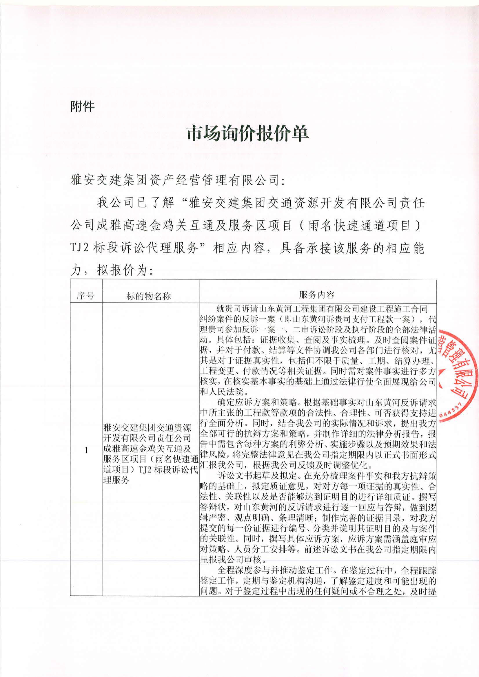 雅安交建集團資產(chǎn)經(jīng)營管理有限公司成雅高速金雞關(guān)互通及服務區(qū)項目(雨名快速通道項目)TJ2標段訴訟代理服務項目市場調(diào)查公告