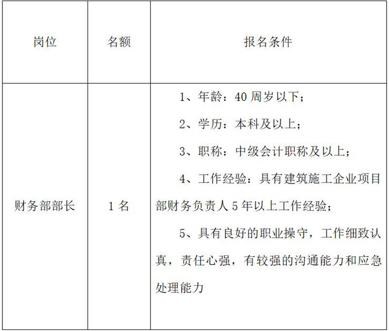 雅安交建集團(tuán)路橋有限責(zé)任公司是雅安市交通建設(shè)(集團(tuán))有限責(zé)任公司下屬子公司,主要從事道路、橋梁修建,F(xiàn)根據(jù)公司業(yè)務(wù)發(fā)展需要,擬向社會公開招聘1名財務(wù)部部長,現(xiàn)將有關(guān)事項公告如下: