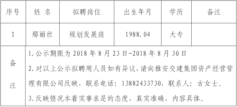 通過公開報(bào)名、資格審查、綜合測試等程序,經(jīng)雅安交建集團(tuán)資產(chǎn)經(jīng)營管理有限公司研究確定以下1名擬聘用人員,現(xiàn)公示名單如下: