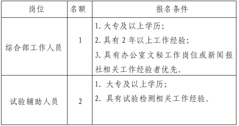 雅安交建集團(tuán)工程檢測(cè)有限公司是雅安市交通建設(shè)(集團(tuán))有限責(zé)任公司下屬子公司。主要從事主要從事公路、橋梁及隧道等的檢測(cè)等業(yè)務(wù),F(xiàn)根據(jù)公司業(yè)務(wù)發(fā)展需要,擬招聘3名工作人員,現(xiàn)將有關(guān)事項(xiàng)公告如下:
