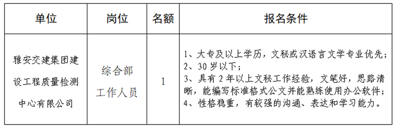 根據(jù)發(fā)展需要,決定面向社會(huì)公開(kāi)招聘雅安市交通建設(shè)(集團(tuán))有限責(zé)任公司(以下簡(jiǎn)稱“雅安交建集團(tuán)”)所屬子公司工作人員1名,現(xiàn)將有關(guān)事項(xiàng)公告如下: