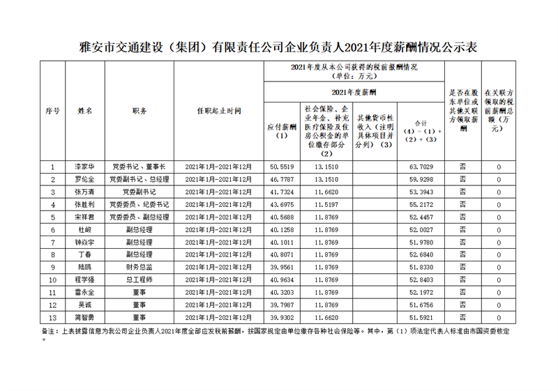 :雅安市交通建設(集團)有限責任公司企業(yè)負責人2021年度薪酬情況公示表