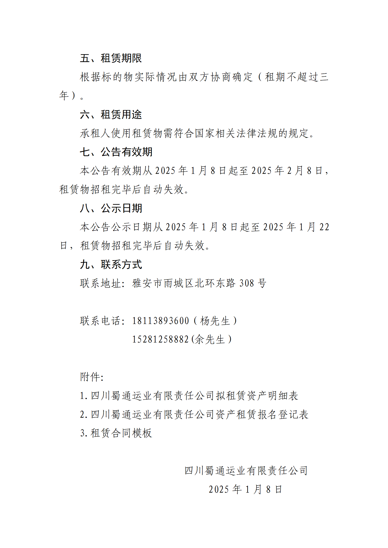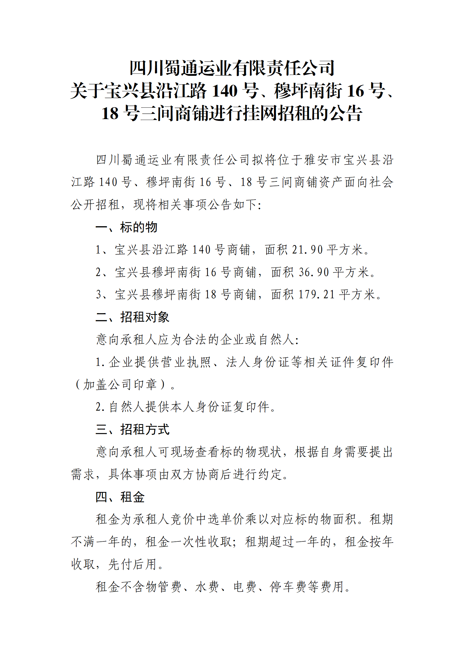 四川蜀通運業(yè)有限責任公司 關于寶興縣沿江路140號、穆坪南街16號、18號三間商鋪進行掛網(wǎng)招租的公告