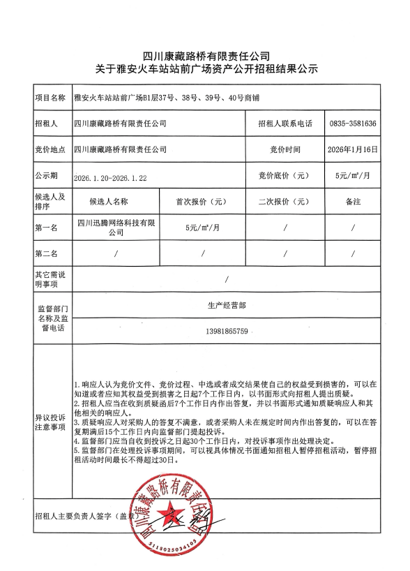 四川康藏路橋有限責(zé)任公司關(guān)于雅安火車站站前廣場資產(chǎn)公開招租結(jié)果公示