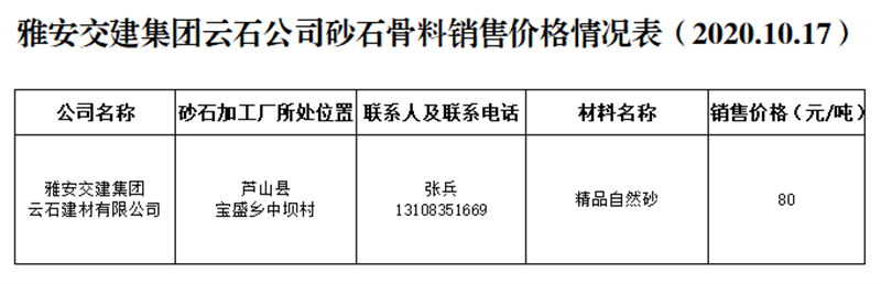 ÑŰ²½»½¨¼¯ˆF(tu¨¢n)ÔÆÊ¯¹«Ë¾É°Ê¯¹ÇÁÏäNÊÛƒr¸ñÇé›r±í£¨2020.10.17£©