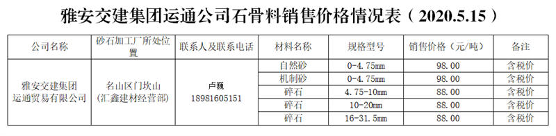 運通貿(mào)易有限公司。運通公司是雅安市交通建設(shè)(集團)有限責任公司獨資子公司,主要負責雨城區(qū)中心城區(qū)河道外砂石經(jīng)營管理工作。目前,公司與名山區(qū)匯鑫建材經(jīng)營部確定了代加工合作關(guān)系,已投產(chǎn),預(yù)計年生產(chǎn)能力約30萬噸。