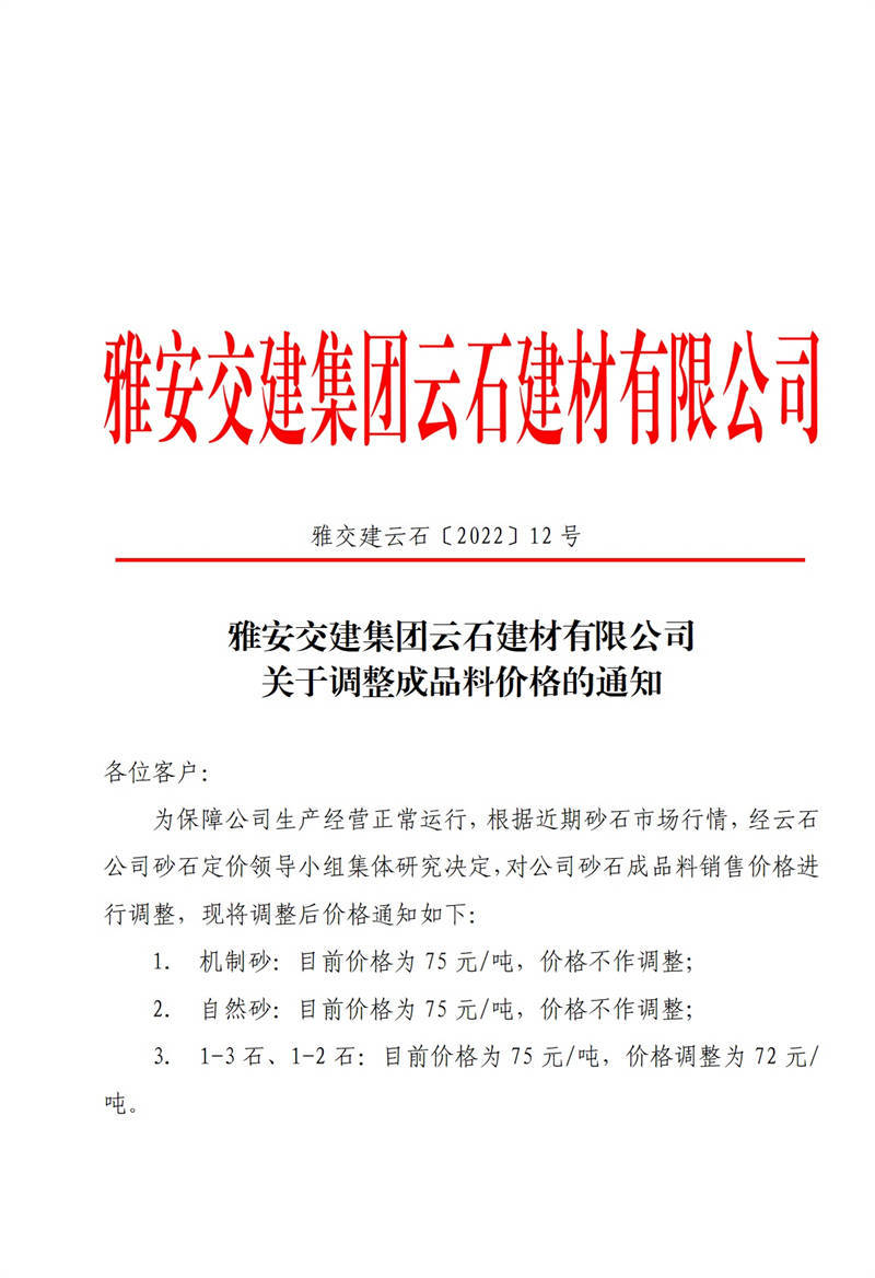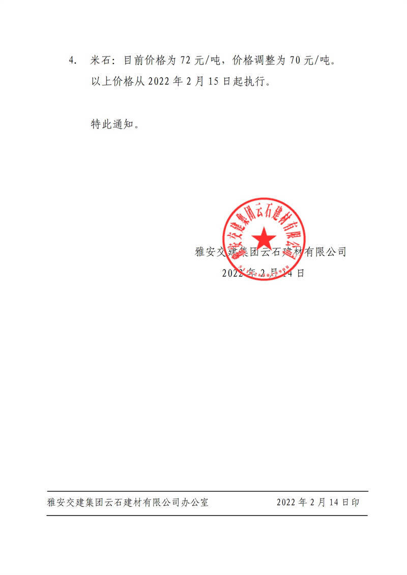 ÑŰ²½»½¨¼¯ˆFÔÆÊ¯½¨²ÄÓÐÏÞ¹«Ë¾êPÓÚÕ{(di¨¤o)Õû³ÉÆ·Áσr¸ñµÄ֪ͨ£¨2022-2-14£©