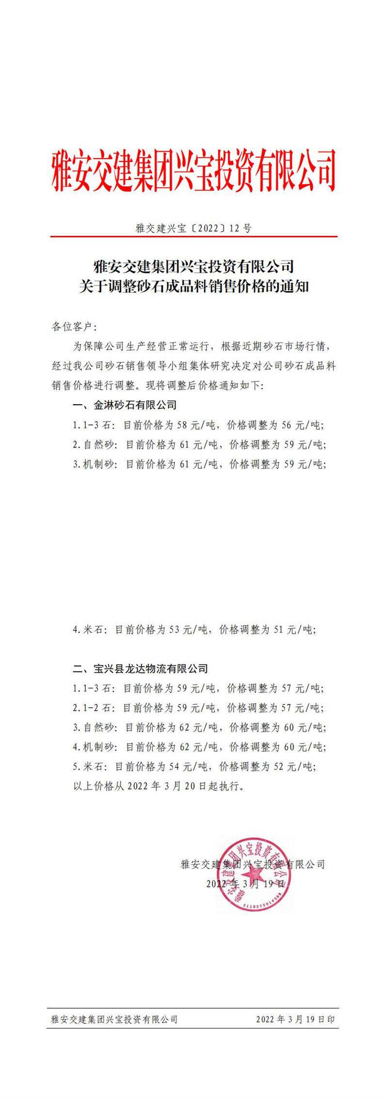ÑŰ²½»½¨ÅdŒš¹«Ë¾êP(gu¨¡n)ÓÚÕ{(di¨¤o)Õûɰʯ³ÉÆ·ÁÏäN(xi¨¡o)ÊÛƒr(ji¨¤)¸ñµÄ֪ͨ£¨2022-3-1£©