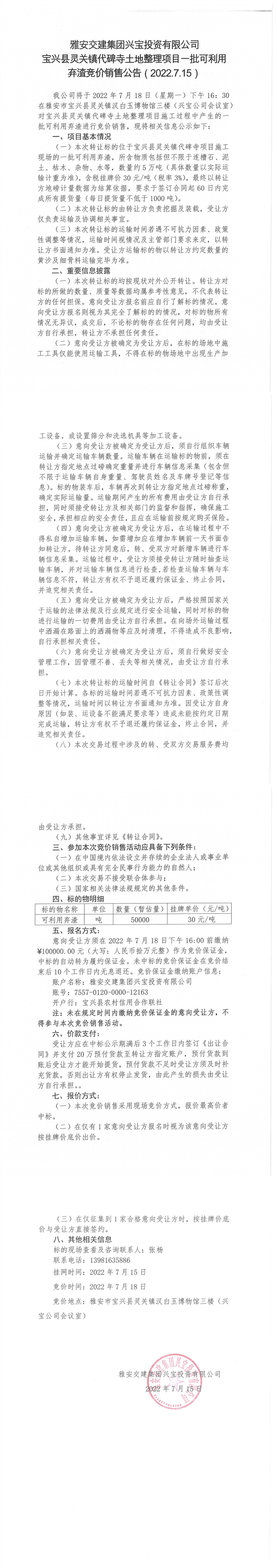 寶興縣靈關鎮(zhèn)代碑寺土地整理項目一批可利用棄渣競價銷售公告7.15(5萬噸)