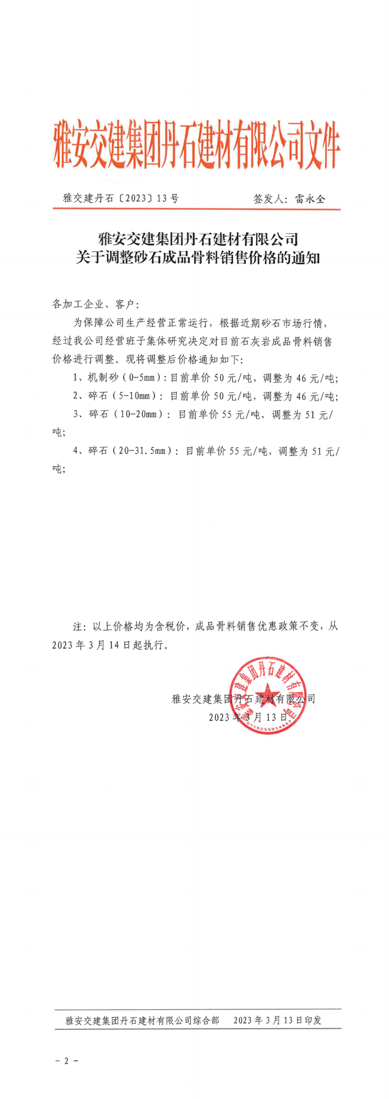 雅安交建集團(tuán)興寶投資有限公司關(guān)于調(diào)整成品料價格的通知(2023.03.13)