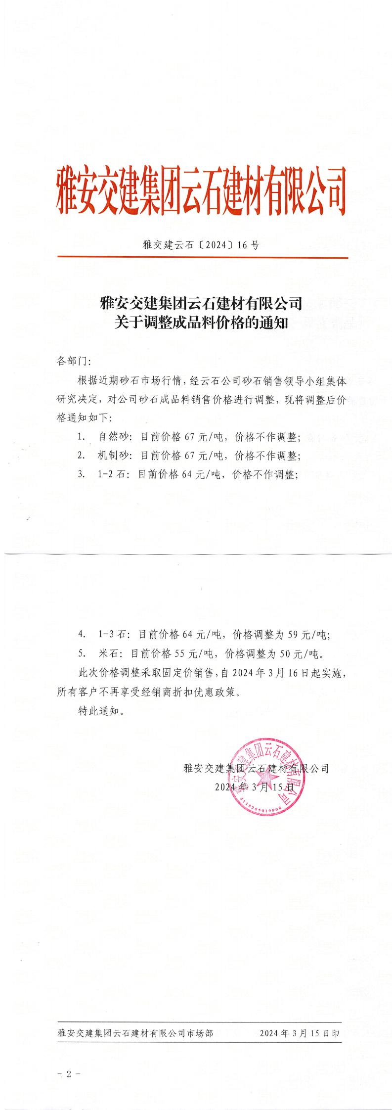 雅安交建集團(tuán)云石建材有限公司成品料價(jià)格調(diào)整公告(2024-2-21)