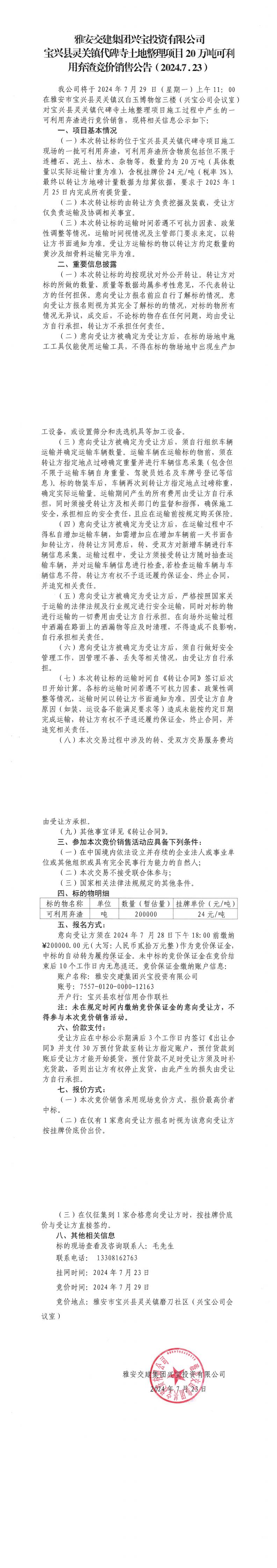 雅安交建集團興寶投資有限公司靈關(guān)鎮(zhèn)代碑寺土地整理項目20萬噸可利用棄渣競價銷售公告(2024.7.23)
