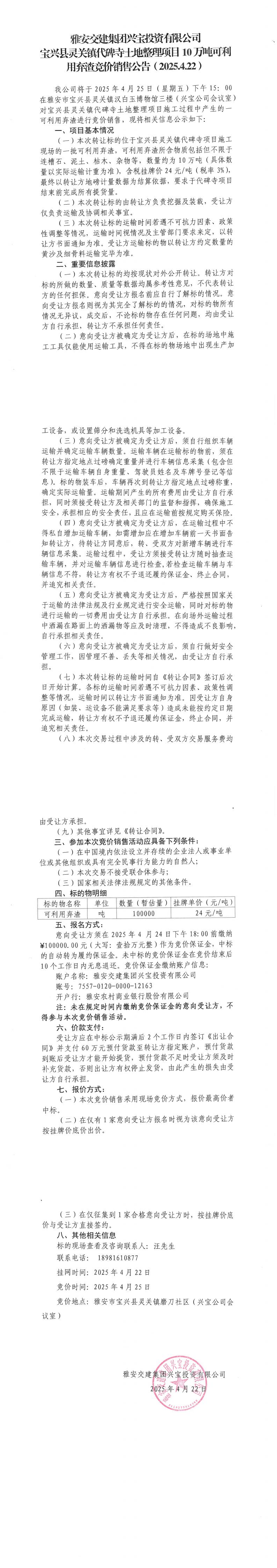 雅安交建集團(tuán)興寶投資有限公司寶興縣靈關(guān)鎮(zhèn)代碑寺土地整理項(xiàng)目10萬(wàn)噸可利用棄渣競(jìng)價(jià)銷售公告